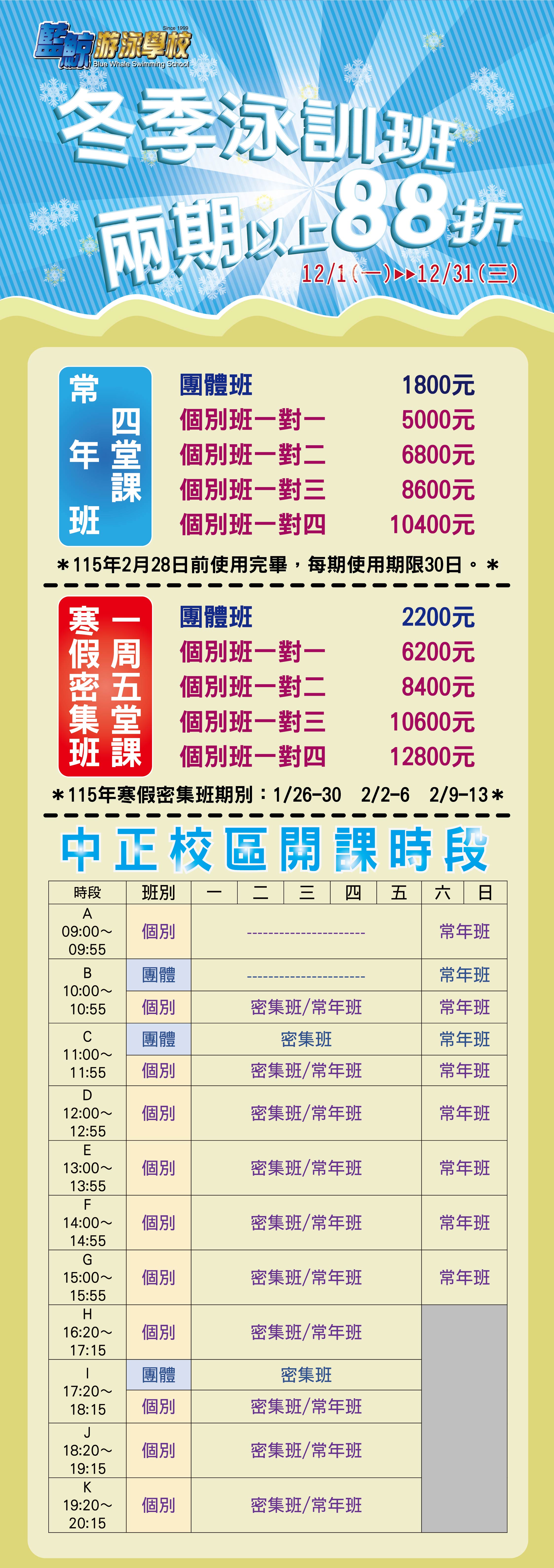 冬季泳訓班班優惠活動開跑!12/1~12/31,一次報名兩期以上享88哲!團體班、個別班、寒假班全部都適用,快來搶好康!